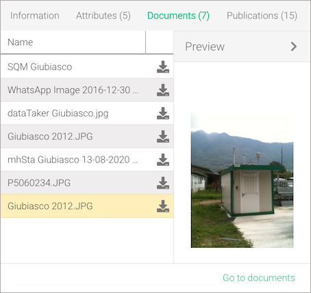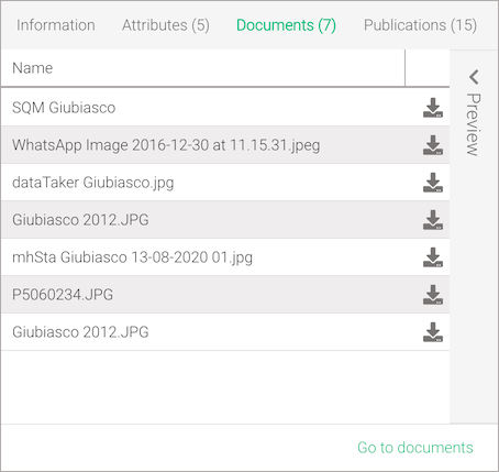 Clicking on the View on map link in the information box will show the location of the location on the map, while clicking on the Go to analysis link will bring back to the selection screen with the location pre-selected. The attributes box contains all the properties grouped that belong to the selected location. The more detailed documents or publications list can be accessed by clicking on the Go to documents or Go to publications link located at the bottom of the documents or publications box. By double-clicking on a document or clicking on the button, the document preview can be accessed (figure-location-documets-2). Supported formats for previews are .png, .jpg, .pdf, .doc(x) and .xls(x).