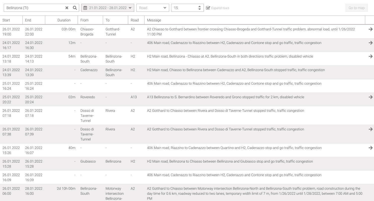 The system receives Viasuisse data concerning only Canton of Ticino and on the A2 and A13 highway axes; data concerning other cantons are not present.